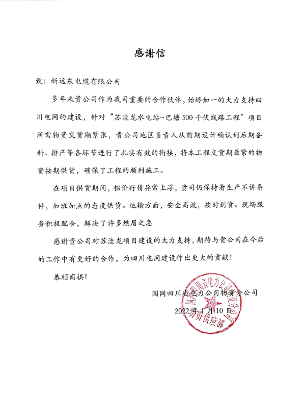 In addition, the professional technical personnel responsible for the project were consistently praised by the customer for their technical capabilities and service levels. They provided multiple on-site technical services and support during construction, greatly facilitating the smooth progress of the project. In appreciation, the Materials Branch of State Grid Sichuan Electric Power Company sent a special letter of thanks to New Far East Cable. The letter particularly commended that New Far East Cable not only delivered goods on time within a short period but also provided strong support throughout all stages—from initial design confirmation to material preparation, production scheduling, and transportation—truly acting with urgency for the customer and thinking from the customer's perspective! During the delivery period, despite abnormal surges in aluminum prices, New Far East Cable maintained an attitude of unconditional production, working overtime to ensure supply and guaranteeing the smooth construction of the project. This clearly demonstrates the exceptionally high evaluation given by the Materials Branch of State Grid Sichuan Electric Power Company for the thoughtful and enthusiastic service provided by New Far East Cable.